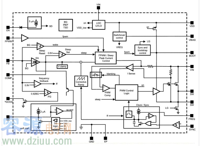 其它特點包括電源良好,可調軟啟動,使能引腳,輸入欠壓保護,以及為減少元件數量內置自舉二極管。