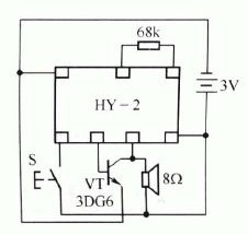 HY-2音樂集成電路內存三首樂曲,每對電路觸發一次,輸出的音樂信號也改變一次。當觸發端與觸發電平相連時,電路將反復鳴奏內存的三首樂曲,直到去除觸發電平為止。HY-2音樂集成電路的典型應用電路如圖所示。 :