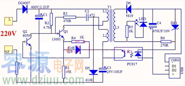 L3輸出電壓經(jīng)D6整流、C4濾波后通過USB座給負(fù)載供電。LED1和R5組成輸出指示電路。DZ1、IC1、Q2等組成取樣比較電路,檢查輸出電壓的高低。當(dāng)負(fù)載變輕或電源電壓升高等原因?qū)е螺敵鲭妷荷邥r,Z1擊穿,IC1中發(fā)光二級管電流增大,IC1中光敏三極管電流增大。L2反饋繞組中的感應(yīng)電壓經(jīng)IC1中的光敏三極管到Q2基極,Q2基極電流增大,集電極電流增大,Q1基極電流減小,集電極電流減小,負(fù)載能力變小,從而導(dǎo)致輸出電壓降低。當(dāng)輸出電壓降低后,Q2取樣后又會截止,Q1的負(fù)載能力變強(qiáng),輸出電壓升高,這樣起到自動穩(wěn)壓作用。D5為L2繞組輸出電壓整流二極管,C3為濾波電容。