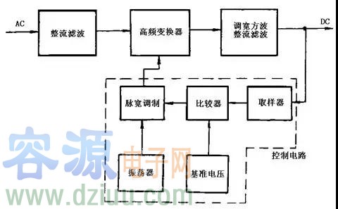 調寬式開關穩壓電源的基本原理可參見下圖。