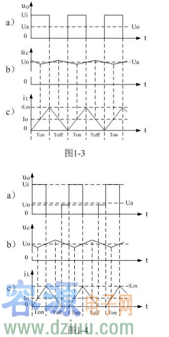 圖1-3、圖1-4、圖1-5分別是控制開關K的占空比D等于0.5、 0.5時,圖1-2電路中幾個關鍵點的電壓和電流波形。圖1-3-a)、圖1-4-a)、圖1-5-a)分別為控制開關K輸出電壓uo的波形;圖1-3-b)、圖1-4-b)、圖1-5-b)分別為儲能濾波電容兩端電壓uc的波形;圖1-3-c)、圖1-4-c)、圖1-5-c)分別為流過儲能電感L電流iL的波形。