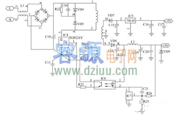 。其核心器件TOP221,三端高壓開關(guān)集成電路,其內(nèi)部集成有電壓型脈寬調(diào)制振蕩器、基準(zhǔn)電壓源、誤差放大器、高壓啟動限流電阻以及過熱等保護(hù)電路。此外在芯片上還集成有耐壓溝道功率場效應(yīng)晶體管,驅(qū)動功耗小。