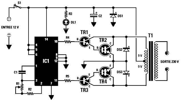 如逆變器電路圖所示,它用作IC1中包含的振蕩器級非穩態多諧振蕩器,CMOS 4047(此邪教系列40xx系列)通過改變R1微調器的電阻值(220 k總" />