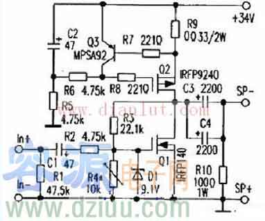 一臺既吸收電子管的“樂感”優勢,又具有晶體管使用方便特點的晶體機,全機主角為Q1N-MOSFETIRFP140,由于是接成單級的增益放大,故為反相輸出,輸出端是喇叭的負端,而接地點才是正端。另外有一顆P-MOSFETQ2