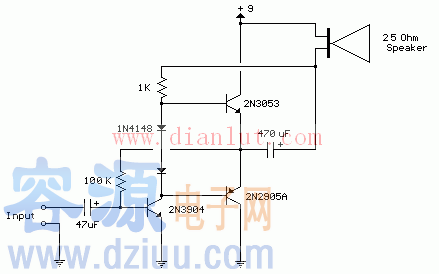 本電路是一個小的音頻放大器類似于一個小的晶體管收音機。輸入級可偏置電壓,使供應分在兩個互補輸出是略微偏導基地之間的二極管三極管平分。 3.3歐姆的電阻串聯使用,輸出晶體管的發射極穩定的偏置電流,因此不
