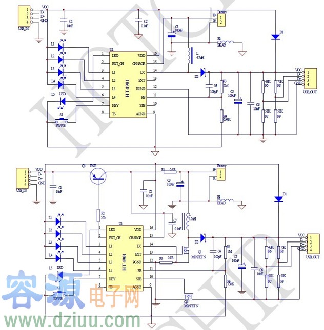 HT4901是一款集成了充電管理模塊、電量檢測及LED 指示模塊、升壓放電管理模塊,完全取代目前市場上的充電管理IC+MCU+升壓IC 方案。如下圖所示: