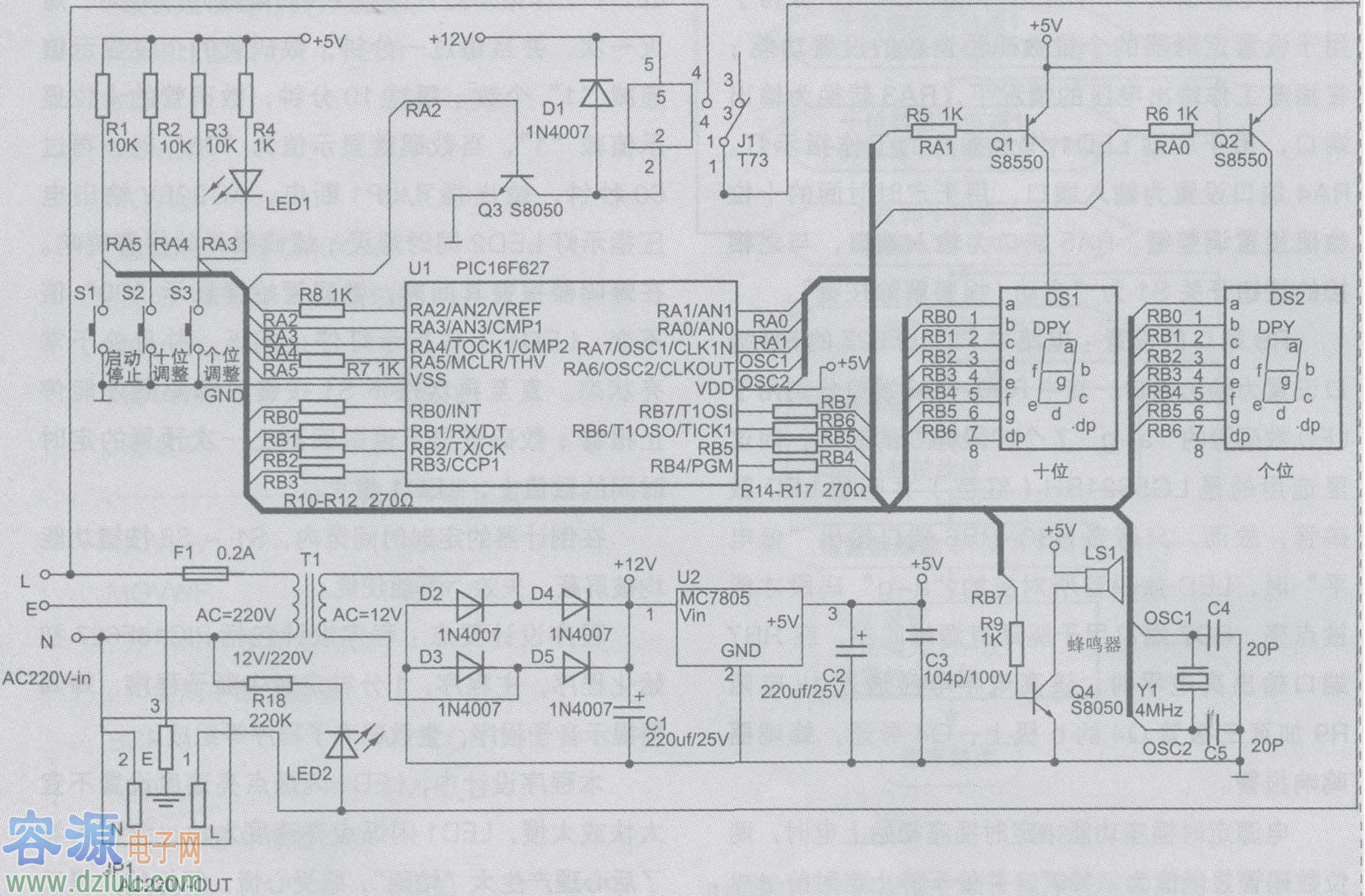 基于PIC單片機的電源定時插座硬件電路如圖1 所示。  電源部分電路:AC220V 交流市電從電路圖1中左下端的三孔插頭輸入到本定時插座中,其中"火線"L 分為兩路分別加在控制電壓輸出繼電器