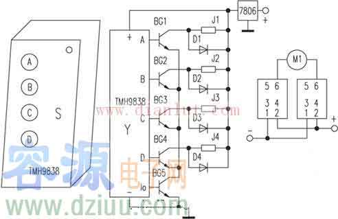 Y為與發射器配對的接收模塊,S為四位無線遙控發射器。Y的各輸出端經BG1~BG5放大后,將四路互鎖存數據控制輸出端信號轉換成非鎖存形式,并通過繼電器J1~J4對電機M1、M2進行正反控制。M1控制
