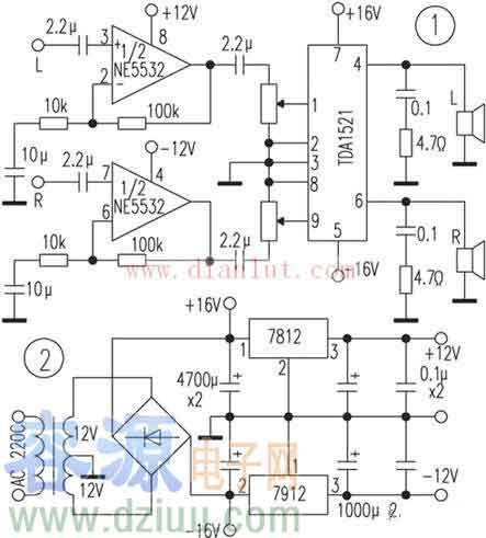 一、功放  功放部分采用高保真集成塊TDA1521,該集成電路外圍電路極其簡潔,而且還有過熱、靜噪、短路等保護電路,適合初學者自制。前級采用NE5532(是一種雙運放高性能低噪聲運算放大器,它顯示