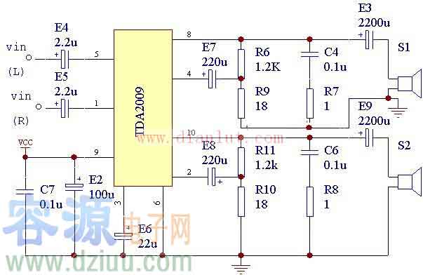 TDA2009是常見的高保真功放集成塊。額定功率為2×10W.電源電壓為8~28V。最大輸出電流為3.5A。具有過熱保護電路。(2×10W,THD=0.5%)  本電路采用該TDA2009所做的幾套功放來看,效果還是很不錯的,本電路地線