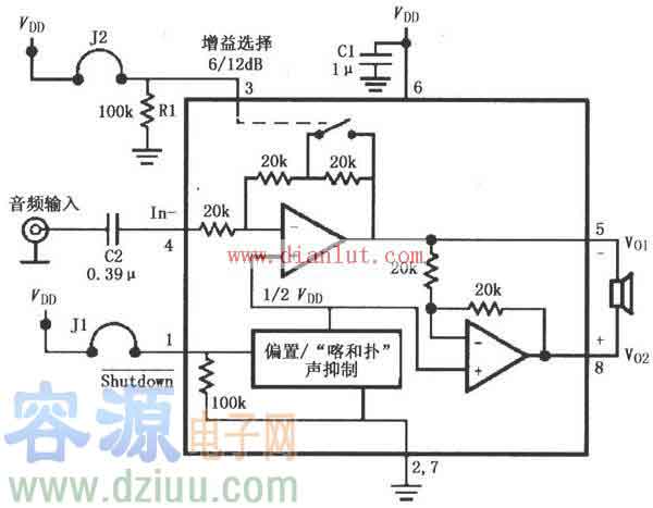 工作原理:只要增大R3即可提高放大器的增益。在R3兩端并聯(lián)電容C4,用于對(duì)高頻提供低阻通路濾波,防止高頻自激。J1為跳線,當(dāng)J1接通時(shí),1腳接地,全功率放大工作;當(dāng)J1斷開(kāi)時(shí),1腳為VDD,微功耗關(guān)斷,放大器不工作