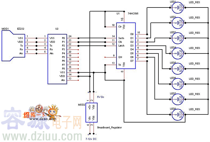 74HC595驅動LED電路圖如下所示: 歡迎轉載,信息容源電子網m.zskn.com.cn