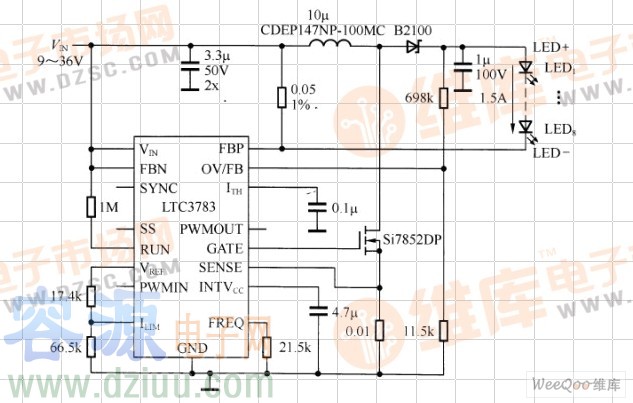 目前有許多LED驅動芯片,可以組戚升壓、降壓、降壓一升壓、回掃和SEPIC變換器拓撲結構。像LT公司的LTC3783不僅可以組成升壓型和降壓型LED驅動電路,而且還可以組成降壓一升壓型LED驅動電路,如圖所示。 采用LTC
