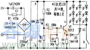 這是一款具有光控功能的LED照明燈,它白天不工作,晚上自動點(diǎn)亮。該燈共用42個(gè)高亮白光發(fā)光二極管,每3支串聯(lián),然后再相互并聯(lián)后接于電源兩瑞,適用于樓梯、過道等作照明! 220V交流電經(jīng)電容限流、橋式整流、