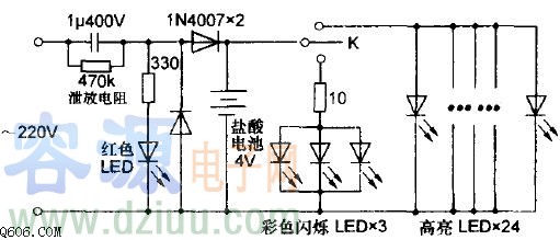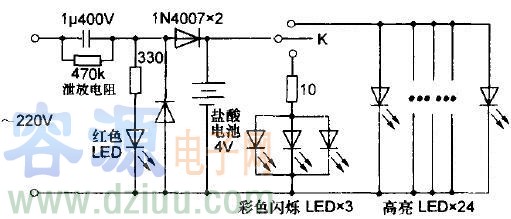 根據(jù)實(shí)物畫出的電路工作原理圖如圖5所示,220V交流市電經(jīng)電容降壓、二極管整流后給鉛酸蓄電池充電,紅色LED作充電指示。充好電后使用時(shí)閉合按鈕開關(guān)K,將首先接通3顆彩色閃爍LED,發(fā)出夢幻般變化莫測的七彩光芒,在
