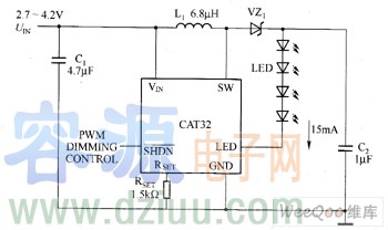 CAT32是一個(gè)DC/DC升壓變換器,它的輸出電流可調(diào)。當(dāng)工作在1.2MHz的固定頻率下時(shí),CAT32可使用電感值很小的外部電感器和電容值很小的陶瓷電容。 CAT32可用來驅(qū)動多個(gè)串聯(lián)的白光LED,并提供可調(diào)的電流來控制亮
