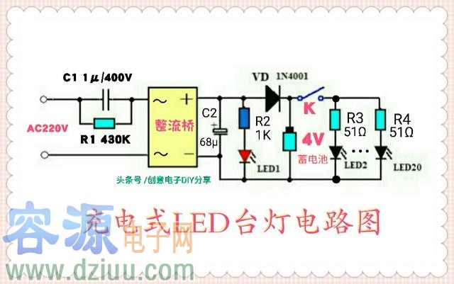 現(xiàn)在不少廉價(jià)的充電式LED臺燈都采用4V的小蓄電池作電源,簡單的阻容降壓電路充電,電路的故障率較高。本文詳細(xì)介紹一下這種充電式LED臺燈電路的工作原理,以方便大家維修時(shí)